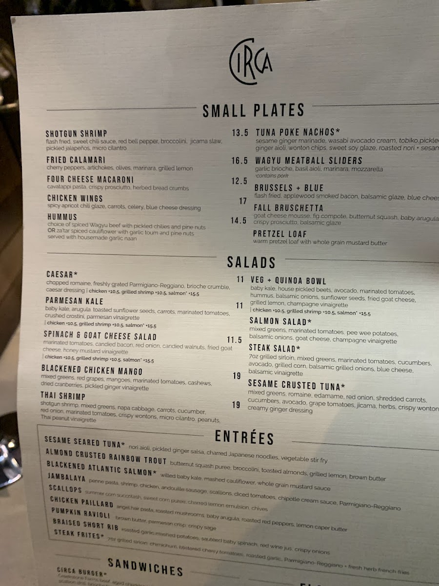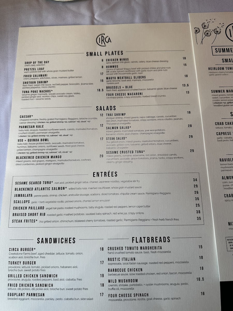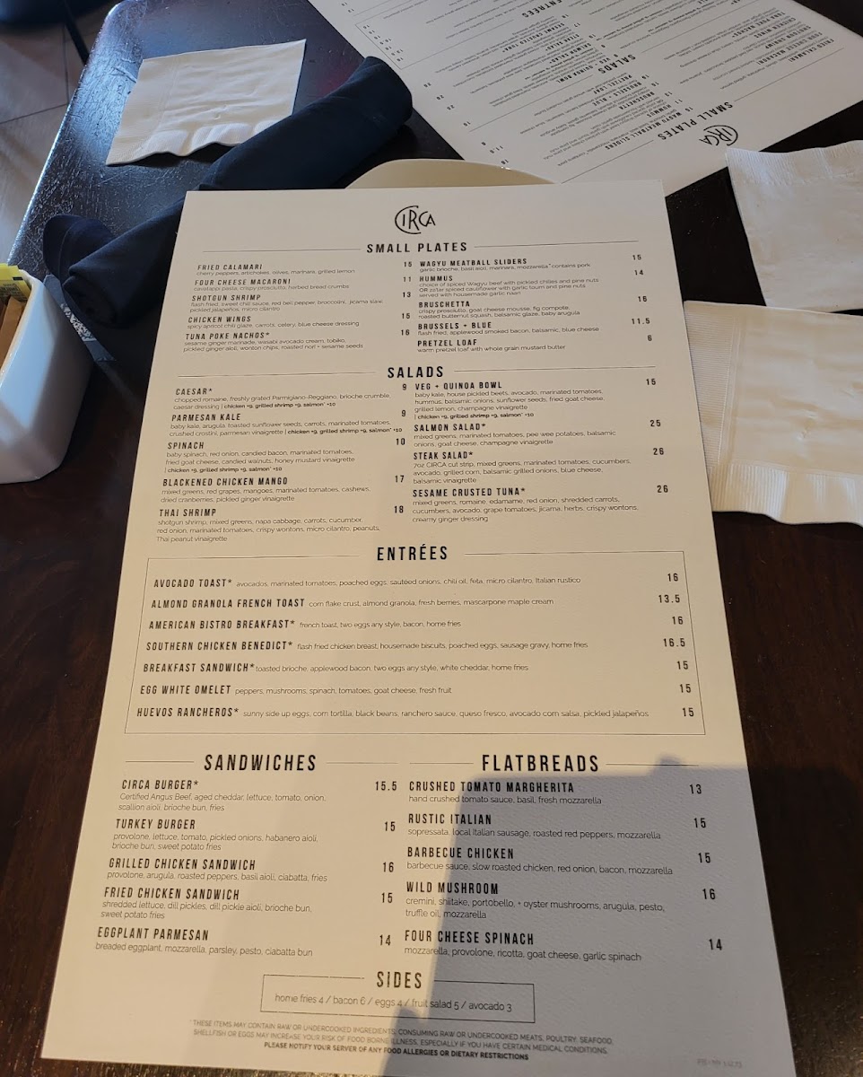The moment you step inside, you are embraced by a delightful ambiance that strikes a perfect balance between sophistication and casual charm. With white tablecloths that hint at upscale dining and the added excitement of strategically placed screens airing games, CIRCA creates an inviting spot for both leisurely brunches and lively dinners.
